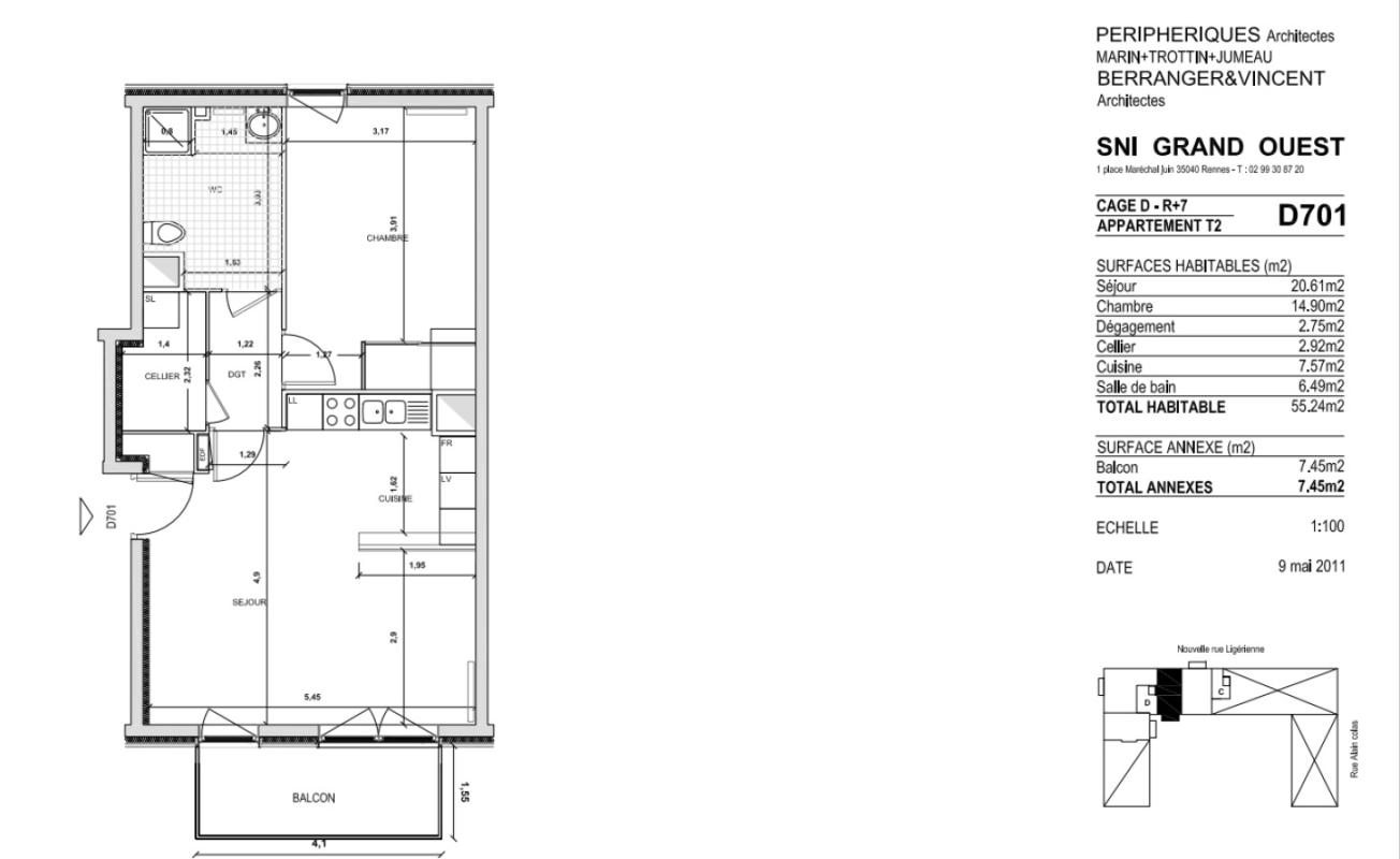 SANS HONORAIRES. SOUMIS A PLAFOND DE RESSOURCE. NANTES - 8 RUE PAULINE ROLAND. Venez découvrir cet agréable appartement T2 de 55.24 m² au 7ème étage d'une résidence récente située au pied du pont Tabarly, proche du centre commercial Beaulieu et de la ligne de bus C5. Il bénéficie d'un beau séjour de 20.61 m2 avec cuisine ouverte de 7,57 m², d'un cellier, d'une grande chambre de 14.90 m2 et d'une salle d'eau avec wc. Ce logement dispose aussi d'un balcon et d'une place de stationnement en sous-sol sécurisé. Le chauffage, l'eau chaude et la taxe d'ordures ménagères sont inclus dans les charges. Logement soumis aux plafonds de ressources PLS, obtention d'un numéro unique départemental obligatoire (www.demandedelogement44.fr). Contactez-nous sans tarder ! Référence à rappeler lors de nos échanges : 907H - 406673 Les informations sur les risques auxquels ce bien est exposé sont disponibles sur le site Géorisques : www.georisques.gouv.fr PLS Prêt Locatif Social