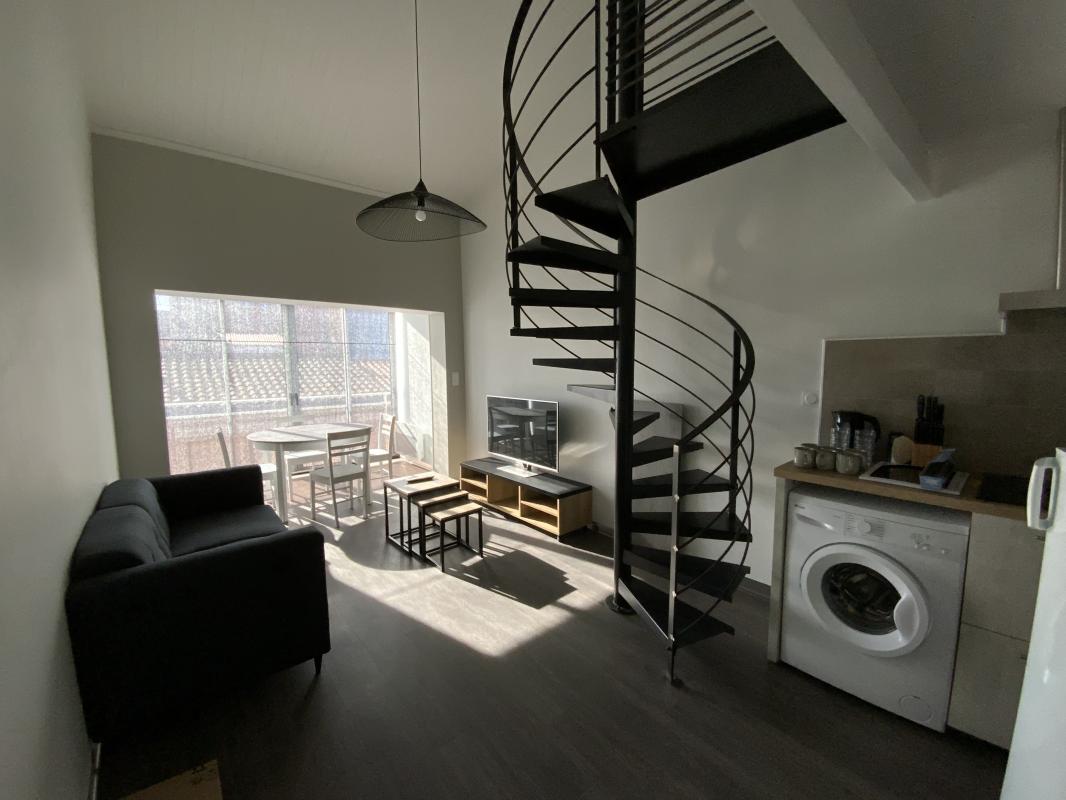 LES SABLES D'OLONNE - Quartier Arago. Au sein d'une rue calme, beau DUPLEX de 44 m2 au 2ème et dernier étage LOUE MEUBLE A L'ANNEE. Il se compose d'une entrée, d'un séjour de 25 m2 avec cuisine US équipée, chambre, salle d'eau, wc séparés. A l'étage, une mezzanine ouverte sur le séjour faisant office de 2ème chambre. Dossier avec garants demandé.