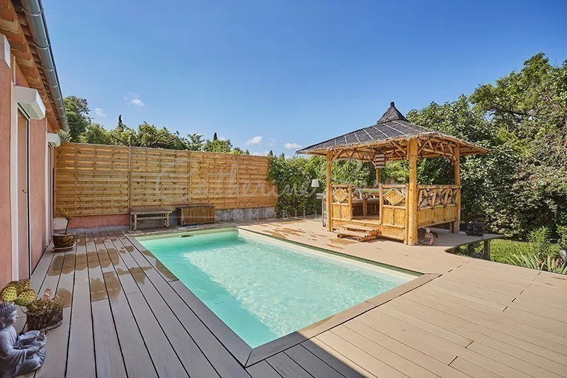 Idéalement située sur le plateau de Puyricard, à quelques minutes à pied des commerces, charmante maison de 110m2 de plain pied composée d'une habitation principale de 92m2 et d'un studio indépendant de 18m2 sur un terrain clos, arboré et sans vis-à-vis d'environ 760m2. Construite en 2007 et rénovée en 2017, elle offre une belle pièce à vivre de 45m2 composée d'une cuisine entièrement équipée et aménagée, ouverte sur un séjour lumineux agrémenté d'un poêle à bois, donnant accès directement au jardin par une belle terrasse de 70m2 intégrant une piscine chauffée de 3x6m et un gazebo (pavillon en bambou indonésien offrant un bel espace de vie extérieur). Le coin nuit est composé de deux chambres avec accès terrasse, une troisième pièce pouvant servir de chambre d'appoint ou de bureau, une buanderie, une salle d'eau et wc séparé. Le studio indépendant, pouvant facilement être relié à la maison, est équipé d'une kitchenette ainsi qu'une salle d'eau et wc. Idéal pour accueillir de la famille ou vous procurer un revenu locatif. Un garage de 35m2 complète cette maison aux prestations soignées : Double vitrage, volets roulants électriques, climatisation réversible gainée, toiture entièrement refaite en 2024, arrêt de bus à proximité. A visiter sans tarder ! RSAC 508793577. Prix de vente : 675 000EUR, honoraires agence inclus de 4% TTC à la charge de l'acquéreur.