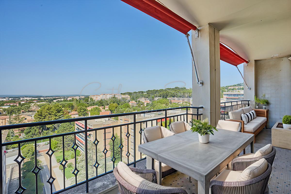 Appartement d'exception ! Aix-en-Provence, secteur Hôpital, dans une résidence de standing verdoyante, appartement avec ascenseur de 131 m2 en dernier étage avec une triple exposition, offrant des vues panoramiques sur tout Aix, de la Sainte Victoire aux collines d'Entremont. Hall d'entrée, séjour double de 47m2 ouvrant par deux grandes baies vitrées sur une terrasse couverte à l'ouest : vues imprenables et magnifiques soleils couchants. Cuisine avec coin repas et 'une vue de carte postale', buanderie attenante. Le coin nuit se compose de trois grandes chambres dont une avec salle d'eau, une toilette séparée; La chambre parentale est mitoyenne à la salle de bain avec une deuxième toilette. Nombreux rangements. Au sous sol, une cave et un garage individuel fermé. Parkings aisés dans la résidence. Charges annuelles de copropriété 5.395 EUR (chauffage, eau froide et eau chaude, gardien, entretien espaces verts... inclus). Copropriété de 330 lots d'habitation. Prix de vente de l'appartement avec une cave et un garage individuel fermé : 830.000 EUR Honoraires d'agence inclus charge acquéreur 4,5% TTC du prix net vendeur. Visite virtuelle 360o de l'appartement disponible. Possibilité d'acquérir un garage en supplément. RSAC 4234 67 455.