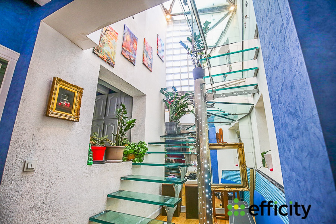 - Au rez-de-chaussée de l'appartement : un double-séjour de 40m² avec poutres apparentes, 5 doubles-fenêtres cintrées et sa grande cheminée en marbre. Une cuisine séparée équipée haut de gamme (14m²). Ces 2 pièces ont accès au jardin suspendu arboré de 67m². Dans un coin isolé, un dégagement avec de nombreux rangements et un wc. De retour côté salon, un second dégagement accueille un très bel escalier avec ses marches en verre et sa rampe en inox, sous son puis de lumière via sa verrière en hauteur et ses pavés de verre muraux.