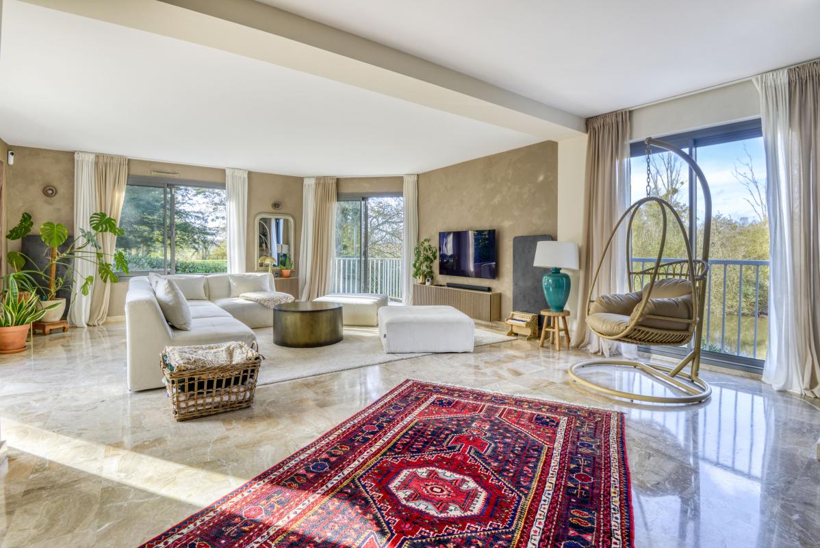 Dès votre arrivée dans la maison vous serez séduit par une très belle pièce de vie de 60 m² avec cheminée, triple exposition et vue sur l'eau.