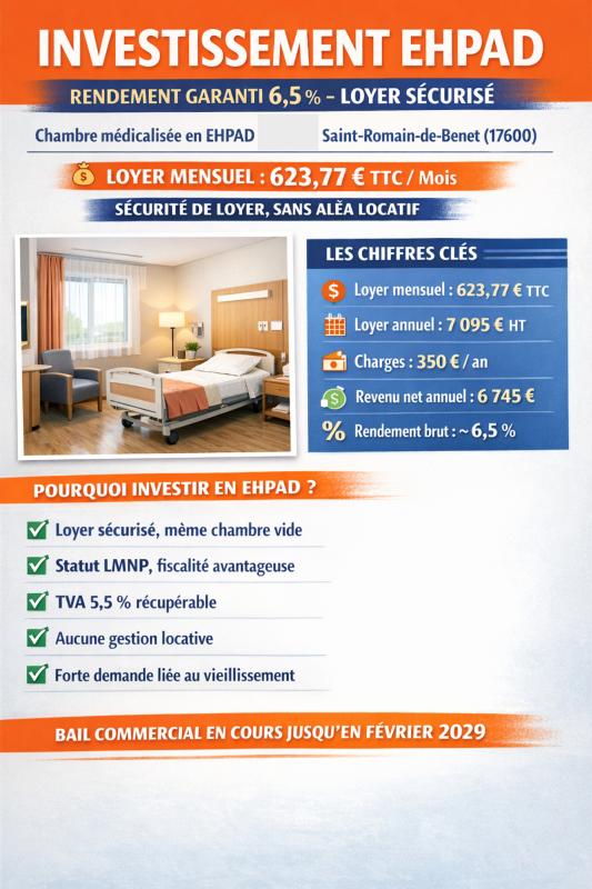 17600 SAINT ROMAIN DE BENET - EXCLUSIVITE - INVESTISSEMENT EHPAD — RENDEMENT GARANTI 6,5 % — LOYER SÉCURISÉ DE 623€/MOIS