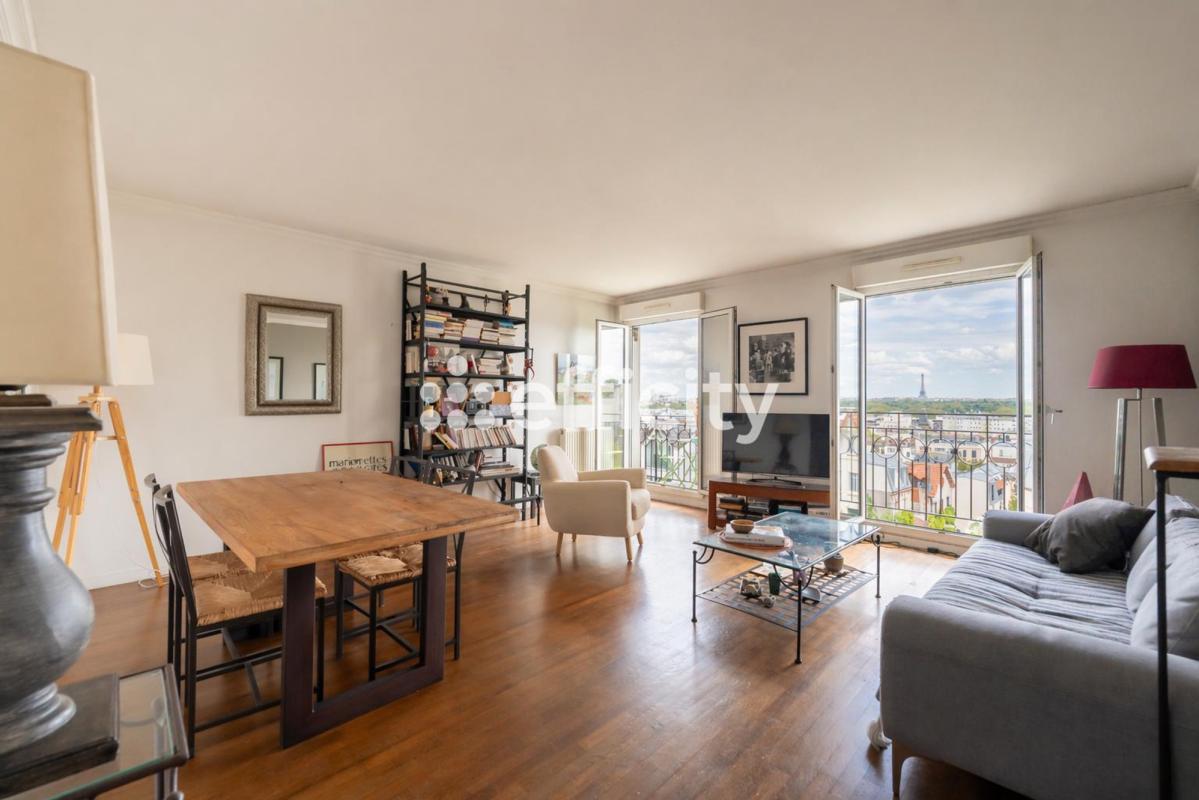 La pièce a vivre baignée de lumière est exposée sud-est et offre une vue panoramique imprenable sur tout Paris à 180°.
